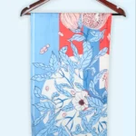 Pomegranate Bloom by Novus is a regal Bemberg Fine Satin scarf ripening pomegranates and white blossoms frame a bold Terracotta canvas adorned with a fleur-de-lis pattern, merging Persian botanicals with European elegance.