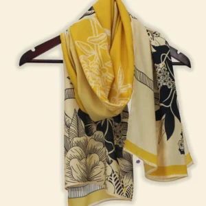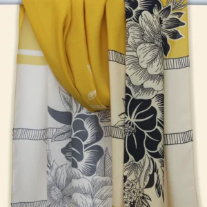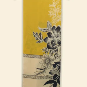 Color: A warm blend of golden yellow and soft beige forms the canvas for this intricately detailed floral design – black and white blooms and leafy motifs stretch gracefully across the surface