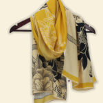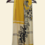 Radiate warmth and classic charm with Shadow Petals the Gilded Gardenia stole. This 24x70 inch rectangular wrap features a sophisticated hero floral arrangement of hand-sketched gardenias and wild blossoms, balanced by clean horizontal pinstripe bands against a rich, sun-drenched mustard background. It is a striking accessory that brings vintage botanical art to a high-fashion, contemporary silhouette.