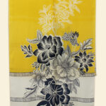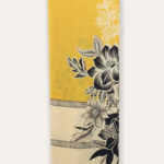 - Design: Clustered gardenia and wild blossom sketches framed by clean architectural pinstripe borders on a golden mustard base