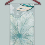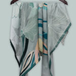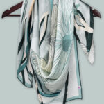 Soft Bloom by Novus is where sophistication meets serene botanical art, crafted in 100% Bemberg Muslin for an airy, luminous drape. Oversized ethereal peonies, sketched with fine, flowing lines, unfurl like a modern mural across a soft geometric mosaic background in cool silver grey sweeping teal stems and cream petals creating a sense of graceful movement and architectural minimalism. The ideal accessory for the woman who desires understated luxury and timeless, contemporary elegance.
