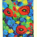 • Design: Dense, high-contrast all-over meadow floral print with scarlet poppies, blue cornflowers, and yellow daisies on a lemon-to-green gradient backdrop