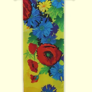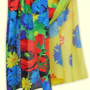 Color: A vibrant interplay of nature-inspired hues – fiery reds, oceanic blues, sunlit yellows, and leafy greens – come together in this botanical print, where bold blossoms bloom across a golden canvas