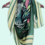 Zebra Flora by Novus is a masterpiece of wearable portraiture, crafted in 100% Bemberg Muslin for a featherlight, airy drape. A regal zebra portrait intricately detailed with flowing stripes that transition into a crown of blooming sunflowers and dahlias is framed by vertical stadium stripes in a sophisticated sage and ochre palette. Where the raw strength of the wild meets the grace of a hidden garden, this scarf is a soulful, artistic statement piece unlike any other.